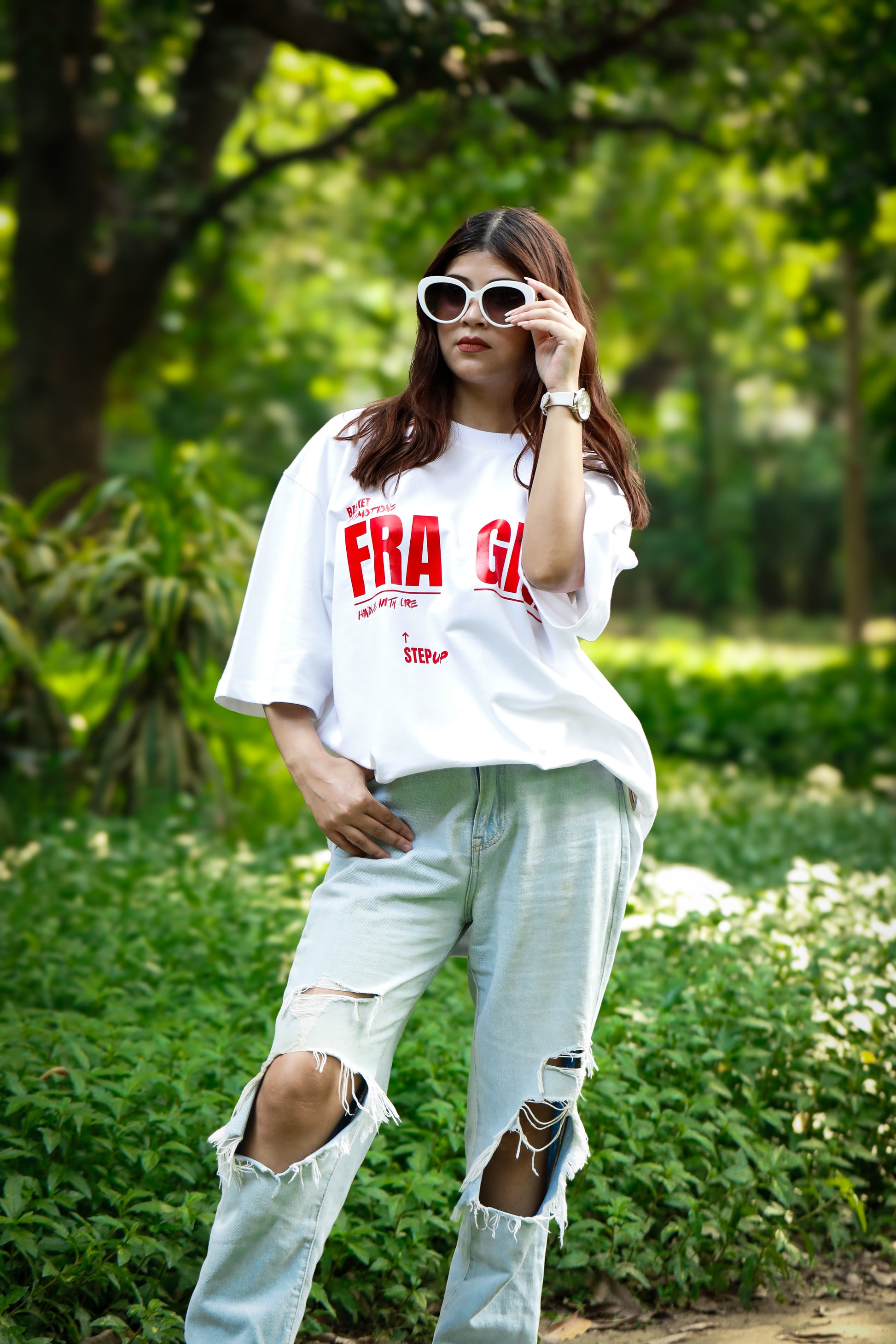 Elevate your wardrobe with our FRAGILE WHITE OVERSIZED TSHIRT. Crafted from 100% cotton and bio-washed, this unisex t-shirt is sure to make a statement. With a luxurious gold finish , it's the perfect blend of comfort and style. Embrace your individuality in this exclusive piece.