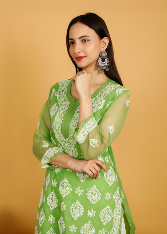 MOHIITO GREEN CHIFFON LUCKNOWI CHIKANKARI KURTI-PLAZO SET